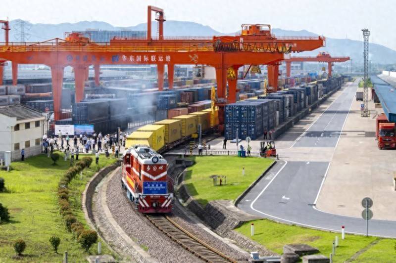 中欧班列是“一带一路”倡议的标志性成果。图为2025年6月18日,在浙江省金华市华东国际联运港,全国首趟“金华—巴希—巴库”跨里海国际运输走廊中欧班列从铁路金华南站鸣笛启程。 人民图片 胡肖飞/摄