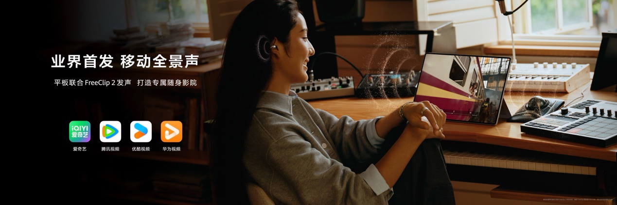 此外,移动全景声技术与 HUAWEI FreeClip 2 耳机协同,平板扬声器播放前置声道,耳机处理环绕声道,形成 360° 沉浸式声场。静谧空间模式在嘈杂环境中独享办公,纯净人声模式支持多人会议,模拟 12 种场景,收录超 100 种噪声类型,通过深度神经网络降低干扰。