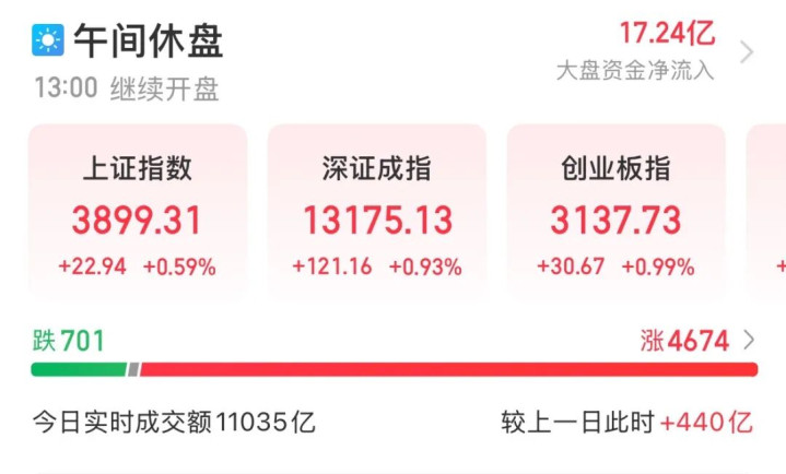 12月19日早盘,A股三大指数震荡走强,深证成指、创业板指盘中均拉升超1%。截至午间收盘,上证指数报3899.31点金牛王,涨0.59%;深证成指、创业板指分别涨0.93%、0.99%。沪深北三市半日成交11035亿元,新易盛成交额110.49亿元,位居A股第一。