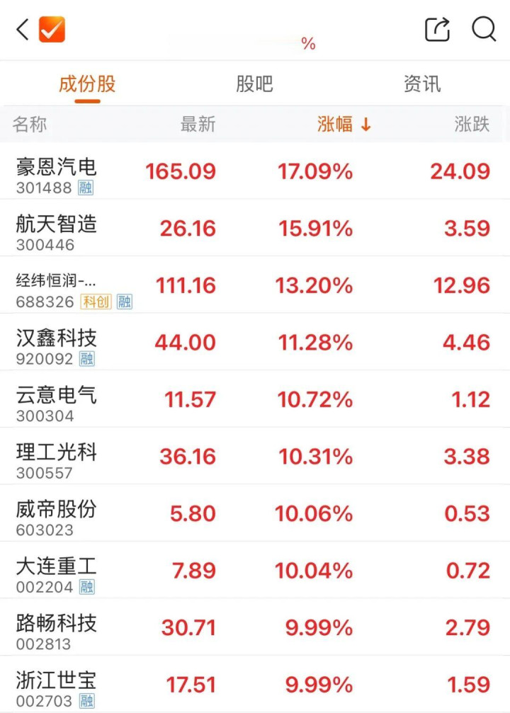 智能驾驶概念今日持续活跃,豪恩汽电盘中触及20%幅度涨停。截至午间收盘,浙江世宝走出4连板行情,豪恩汽电、航天智造等涨超10%,威帝股份、大连重工等涨停。