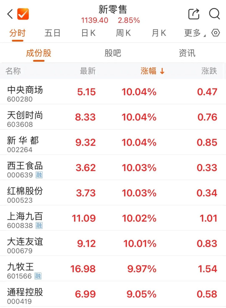 早盘,大消费板块全线爆发。乳业、零售等多个方向涨幅居前。截至午间收盘,庄园牧场3连板,上海九百、中央商场2连板,西王食品、大连友谊等多股涨停。